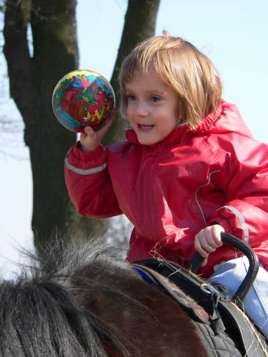Hallo, ich heiße Karolina. Ich bin ein ehemaliges Frühchen - geboren in der 26. SSW mit 970 g und hatte große Startschwierigkeiten in dieser doch manchmal so grausamen und kalten Welt. Leider habe ich durch den frühen Start eine Hirnblutung erlitten, die sich durch eine Infantile Zerebralparese – Spastik in beiden Beinen (Diparese) – zeigt. Außerdem habe ich das Problem, dass meine Muskeln immer sehr angespannt sind und mir dadurch verschiedene Bewegungsabläufe nur durch hohe Konzentration und etwas verlangsamt gelingen. Das freie Laufen habe ich noch nicht gelernt, aber immerhin bin ich stolzer Besitzer von zwei 4-Punkt-Stützen, die auch nicht jeder vorzuweisen hat, und an denen ich zumindest kurze Strecken zurücklegen kann. Zu Nancy gehen wir seit März 2004 und haben zu viert einmal pro Woche einen Riesen-Spaß. Wir vier, das sind Nancy, Mama, ich und – natürlich als wichtigste - Nadua. Am Anfang war es sehr schwierig, richtig oben sitzen zu bleiben, denn durch das Schaukeln bin ich immer zur Seite gerutscht und an Geradesitzen war gar nicht zu denken. Inzwischen kann ich Dank Nancy und Nadua sehr gut aufrecht sitzen, kann meine Sitzhaltung allein korrigieren und sogar einige Zeit freihändig reiten, ohne ängstlich und verkrampft zu sein. Manchmal kann ich mich auch schon zeitweise richtig entspannen, was mir früher immer sehr schwer fiel. Ich freue mich immer auf meine Zeit mit Nancy und dem Pferd... alles lesen